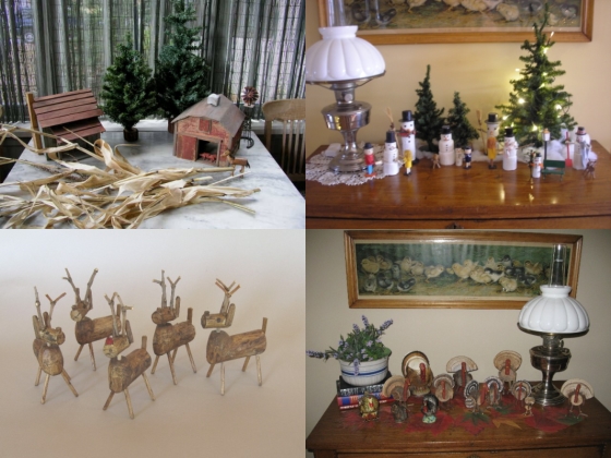 Another time he had a piece of leftover stair rail. From that came snowmen, each made different with scarves (from scrap ribbon), brooms (from scrap straw), and hats (from scrap cloth and paper).