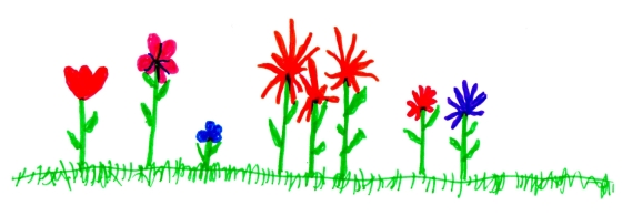 For himself, Danny wanted to use all the colors. Red, blue, green, yellow, orange …. He set about making a whole flower garden. It even had a lawn. As he worked, Nicker came back, dropped the brown marker on the table and went off with the gray and the black markers. Brown and gray and black flowers? Just what was Nicker up to?