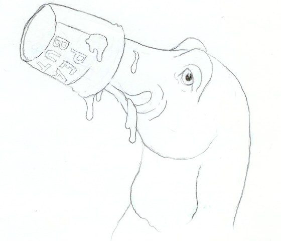 Danny knew just what to do. He got out some bread and a jar of peanut butter. “I’ll get a knife and make you a peanut butter sandwich.” He hadn’t taken two steps when he heard, “Doth blobber.” He turned and saw Nicker with his nose in the jar, and his tongue was busy. Let me tell you, it doesn’t take a hungry sea dragon long. In just moments, Nicker’s tongue was licking the last of the peanut butter from inside the jar. When he was done, the jar looked like it had been washed clean. Nicker’s nose, on the other hand was a mess. It covered with peanut butter from his eyes to his chin and every place between. Worse, the empty jar was stuck on his nose. “Helf helf!” he breathed into the jar.