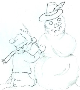 Nicker had never made a snowman before. He had his own idea. Very quickly he slid his body around and over the snowman. This gave the snowman some very unusual curves. Danny smiled and said, “Now it looks almost like a statue.”