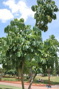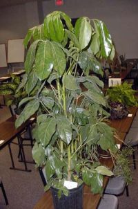There are many kinds of schefflera. Some stay small. Some get to be over 100 feet tall! Many times they are planted with several in a single pot. |