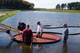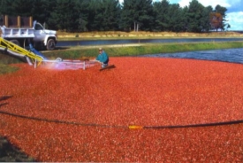 | Can you imagine standing in that many cranberries? | Here is a truckload of cranberries ready For YOU! (Nicker is resting in the pond) |