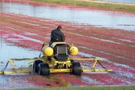 | A machine is used to beat the cranberries so they float in the water | Then they are gathered at one end, washed and taken to a truck |
