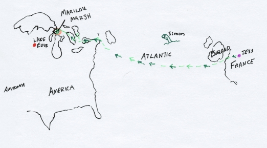 You already know this. Nicker spent some time with his friend Tess in France, and you know what happened to his nose! (You don’t??? Click the Tess link and find out!) He had other adventures, of course, but you’ll have to wait for another day to hear those.Nicker was feeling lonely for home, and especially for Danny (and so am I). He got back in the river, swam and swam and swam across the big Atlantic Ocean until he came to America again. He was still a very long way from Arizona.