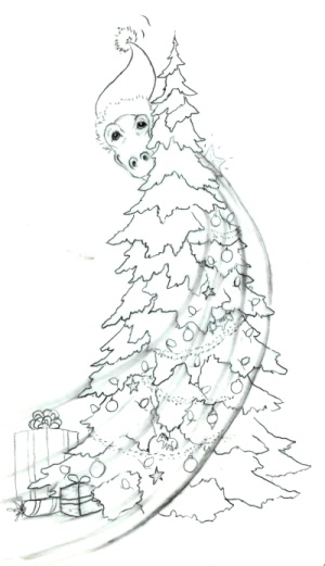As Nicker and Simon were on their way home, Nicker saw a pine tree. A Christmas tree! To Nicker it seemed lonely. So, he gave his magic Santa hat a little twist. He zoomed around and around the tree. Decorations appeared behind him, just like … guess what … just like Christmas magic!