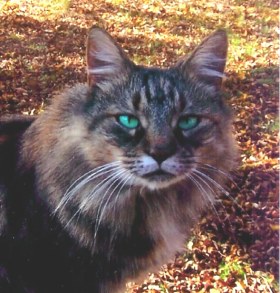 Rusty McFluffer McDuff (also called RustySpoiledCatSupreme, said fast all in one breath) comes from Michigan where she owns a very special person – Nicker’s artist, Marci. “Rusty just showed up one morning, a real mess and in need of a brushing. Obviously she had been traveling some distance. She was also starving. I fed her and brushed her but did nothing more to encourage her to stay. Over the next week, I asked around but no one was missing a cat. I even ran an ad in the local paper. Rusty decided to move in. She has been here since.”