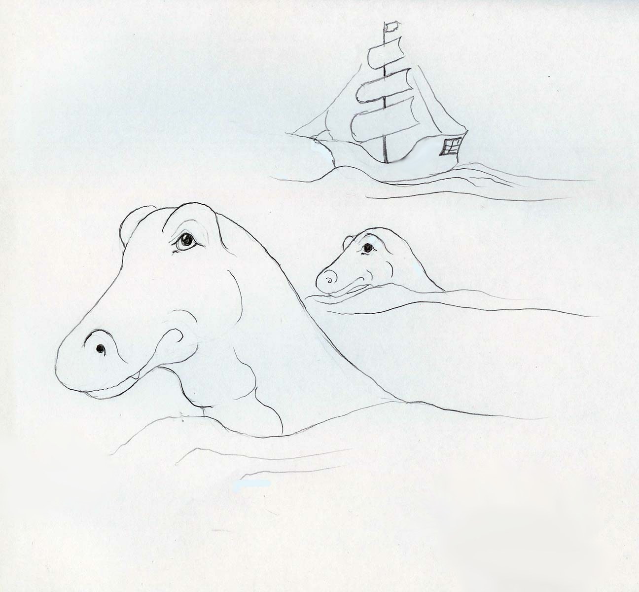 “AHEM,” Gordie said in a voice that rattled the walls. The two boys became very quiet. “As I was saying ….” He paused a moment. His voice became gentle again. “My father was teaching me about the oceans when humans began to leave the land in those boats. They didn’t know much back then. There were bad creatures. My father, his father, and his father made sure they didn’t get TOO bad. Now and then they would eat a ship. Usually those first humans simply got lost.