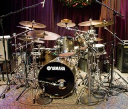 A drum set, or drum kit, has a number of drums, each different. There is usually a bass drum for the deeper sounds. That is usually played with a foot pedal. Stomp on the pedal and a cloth covered mallet hits the drum to make the low (but loud) sound. Placed around the drummer are other kinds of drums of different sizes to make different sounds. It usually includes things like cymbals, which are shaped pieces of metal, usually brass, to make the clanging sound. These also come in all kinds of sizes and types. Each makes its own sound. The drummer might also have other things to hit, like cow bells.