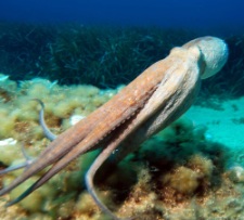 The octopus is a creature that lives in the ocean. They have no bones, unless you call a hard, sharp beak (much like that of a parrot) a bone. It has a head with two eyes and eight arms, called tentacles. These tentacles are covered with suckers on one side. Most octopuses are fairly small. They weigh just a few pounds. However, some have been found that weigh 600 pounds. |