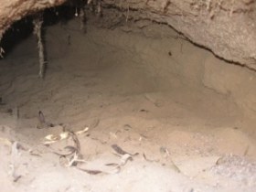 Gordie the Tortie calmly brushed clean the slope that went into his tunnel, then turned around and went back into his cave.